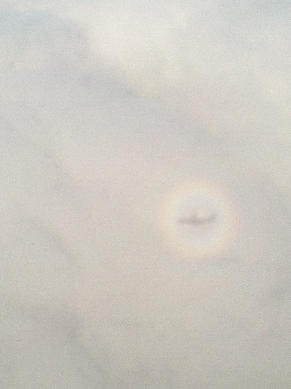 Glory encircling airplaneThe colorful halo always surrounds the observer’s own shadow (in my case, the airplane’s shadow). Interestingly, in China it is called Buddha’s light, showing the observer’s personal enlightenment associated with Buddha. Nope, I’m not Buddhist.