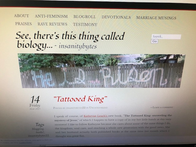 I speak of course, of Kathryne Leach’s new book, Tattooed King: Unraveling the Mystery of Jesus, of which I happen to have a copy of in my hot little hands at this very moment! I like to follow Kathryne because she cares about some of the same things I do, the kingdom, soul care, and reaching a whole new generation with the good news. She and her husband actually both published books at the same time last month which I thought was great fun.